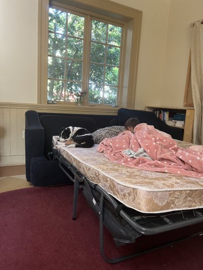 So the first night of being homeless was spent at one of our jobs, a bowling alley. We slept on linoleum floors with thin carpets. We slept on the bowling lanes with blankets. We slept on the party room with souped-up mattress foam beds.