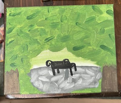 The first thing I had to do was cover the entire picture with white paint. From there, I drew an outline of the background scene and then laid down the paints.