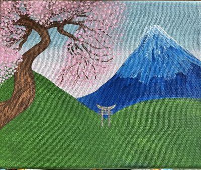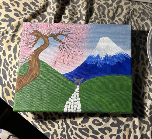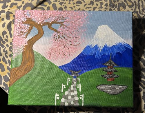 After making some hills with grass, a sunset sky, and a plain mountain, I drew a cherry blossom tree and a small torii gate. I spend a lot of time with the tree – blending, blotting, and dotting to bring out the details. Then I made a cobblestone pattern leading to the torii gate and a pagoda temple with a lake.