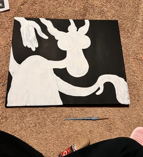 I had to cover his original hands with black paint and then start over again by outlining with white paint.