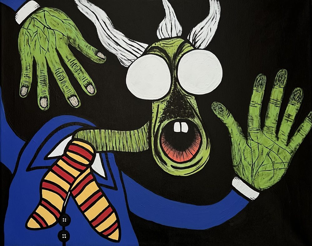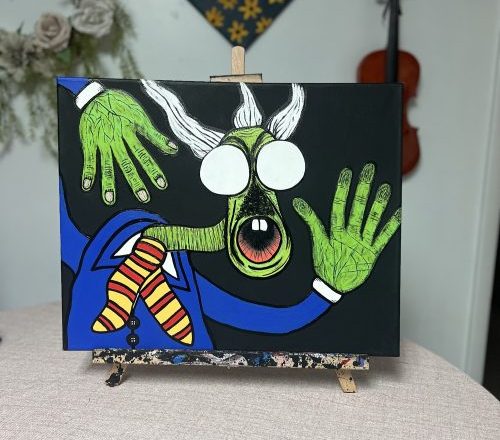 The newest painting that I’ve finished this year is called ‘The Schoolmaster’ – inspiration by Pink Floyd’s album The Wall. The schoolmaster is a character from The Wall album who acts as the antagonist. He’s also pretty cool looking.