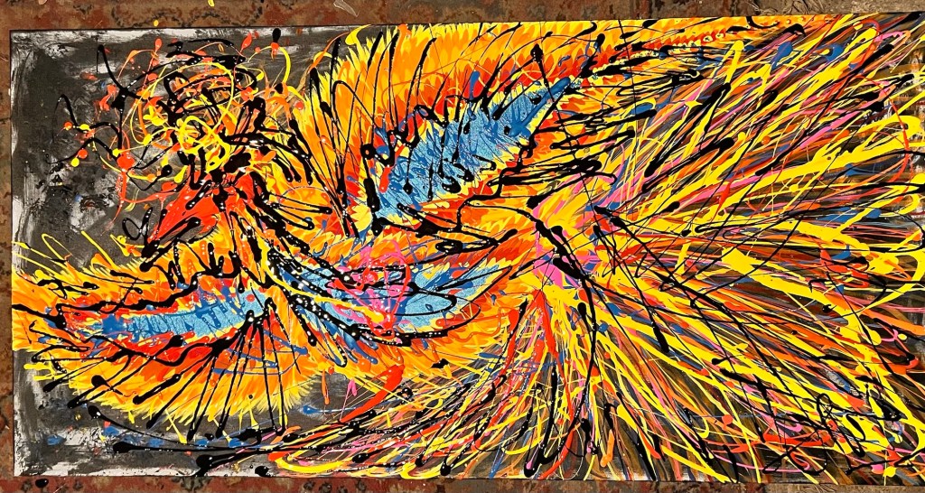 This painting is a coverup of the original piece I was working on but then I lost interest in. The first painting was supposed to be of a phoenix fire bird in like an abstract form, but it didn’t work out.