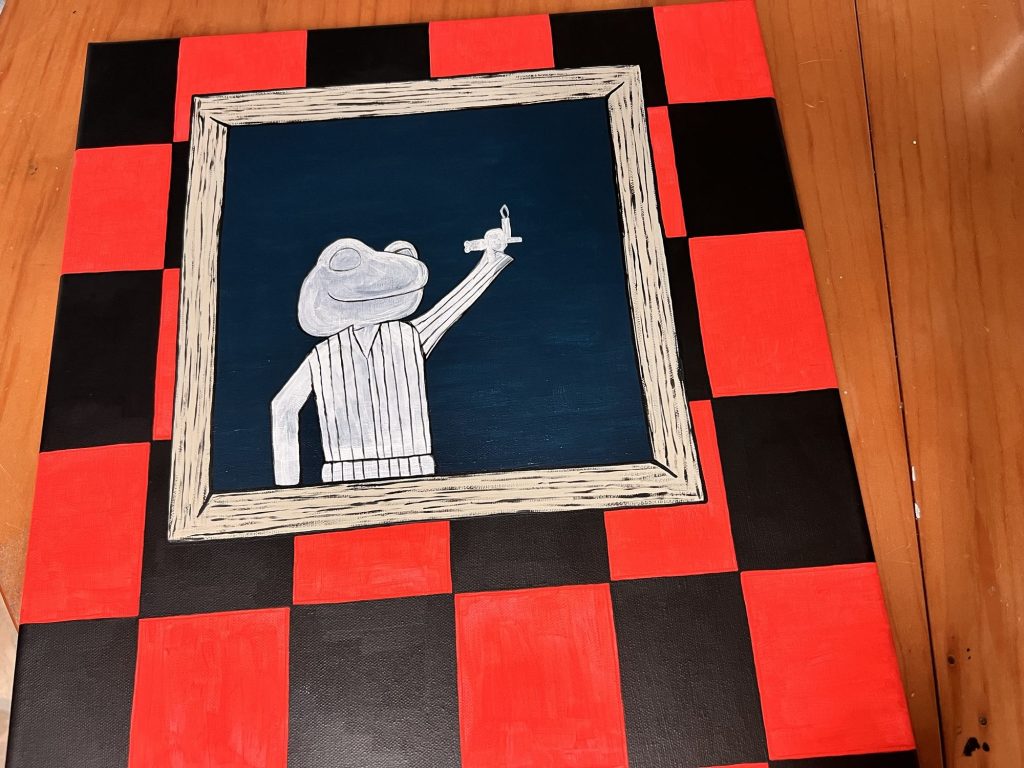 I made a clock on the small canvas and stuck some magnets on the back of each painting so that they could connect with each other. When you don’t feel like looking at the clock, take the time off and enjoy the frog instead!